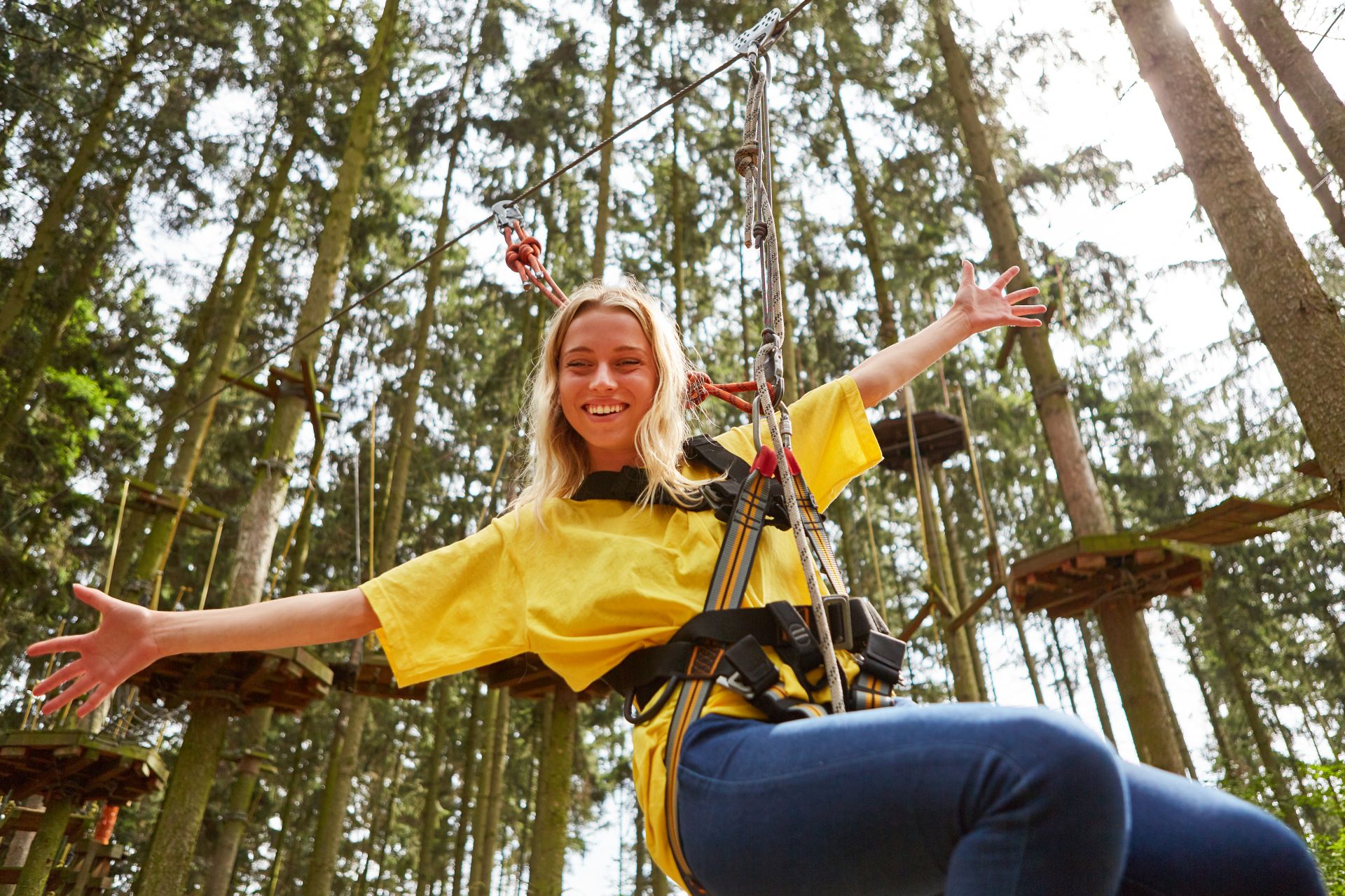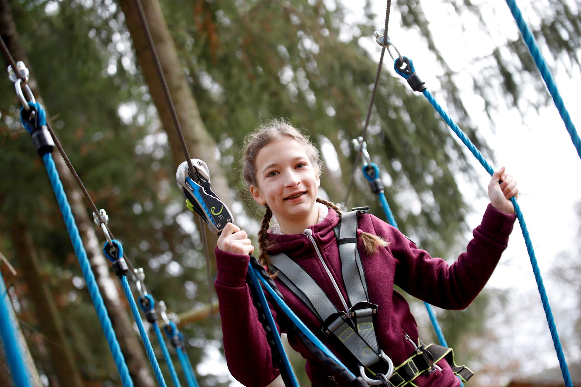 In unmittelbarer Nähe zum Wildgehege und wunderschön in den Wald integriert, stehen dem Besucher elf abwechslungsreiche Kletterparcours mit 110 Kletterübungen zur Verfügung. Es ist ein ganz besonderes Erlebnis, von Baum zu Baum zu balancieren und die Natur aus der Vogelperspektive zu betrachten.